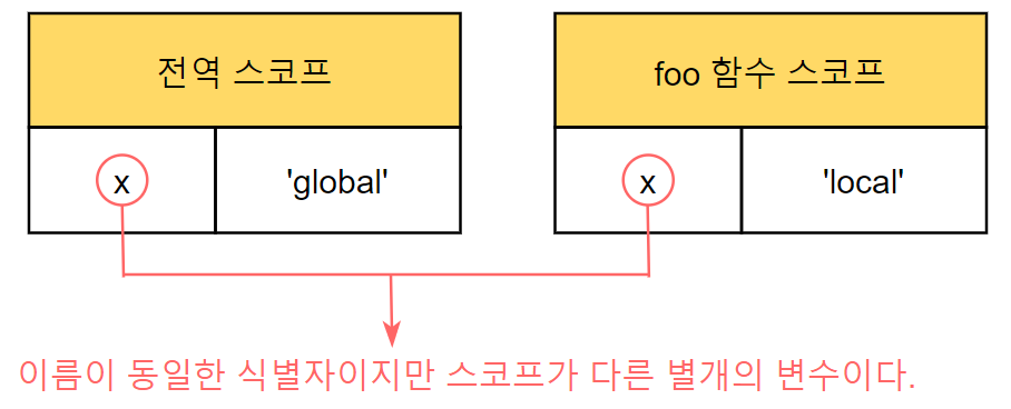 - 변수를 참조할 때 JS engine은 스코프 체인을 통해 변수를 참조하는 코드의 스코프에서 시작하여 상위 스코프 방향으로 이동하며 선언된 변수를 검색(identifier resolution) 한다.