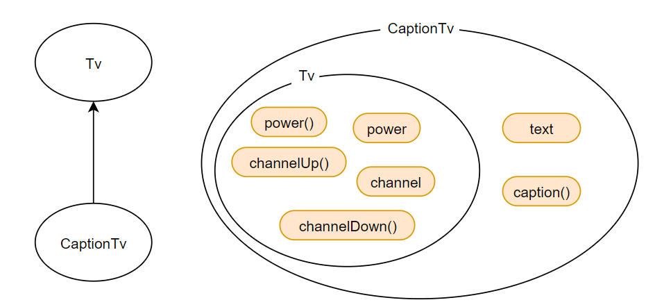 Tv 클래스와 CaptionTv 클래스가 위와 같이 정의되어 있을때, 두 클래스간의 관계를 그림으로 그리면 아래와 같다.