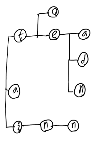 6개의 단어에 대해 trie 알고리즘을 적용했을 때 트리의 구조는 아래와 같다.