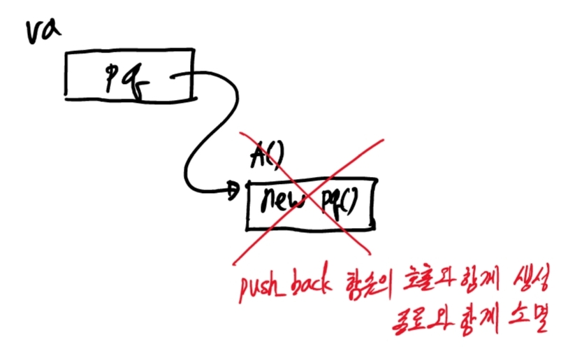 push_back의 호출이 끝나는 순간, 곧바로 A의 소멸자가 호출되면서 pq의 메모리를 해제한다.