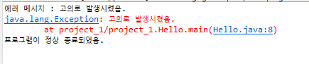 - 프로그램 실행 도중 java.lang.Exception이 발생하여 비정상적으로 종료됐다는 것과 예외가 발생했을 때 호출스택(Call Stack)의 내용을 알 수 있다.