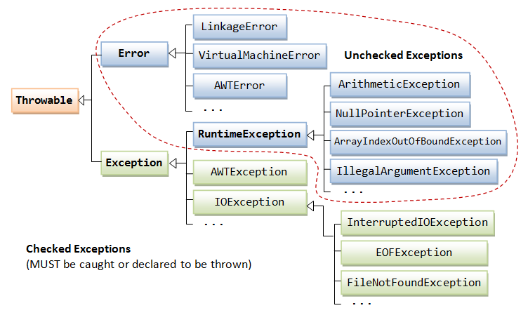 - JAVA에서는 런타임 에러를 에러(error)와 예외(exception) 두 가지로 구분하였다.