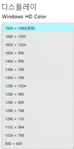 디스플레이 설정창에 나오는 선택가능한 해상도들과 거의 일치하는 모습을 볼 수 있다.
