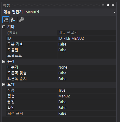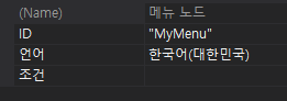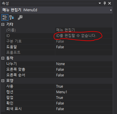 가령 Menu1은 하위에 다른 항목들이 더 있으므로 속성창에서 ID의 기입이 불가능하다.