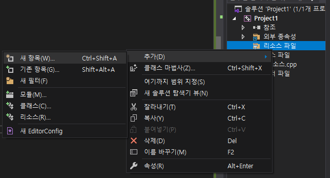 프로젝트 내의 리소스파일 폴더를 우클릭하고 새항목을 클릭한다