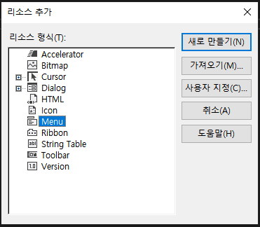 리소스뷰의 Menu.rc 폴더를 우클릭하여 Menu 리소스를 추가해본다.