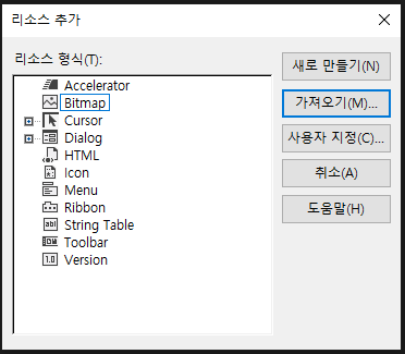 비트맵을 선택하고 가져오기를 눌러, PC에 저장된 파일 중 리소스로 쓸 BMP 파일을 가져온다.