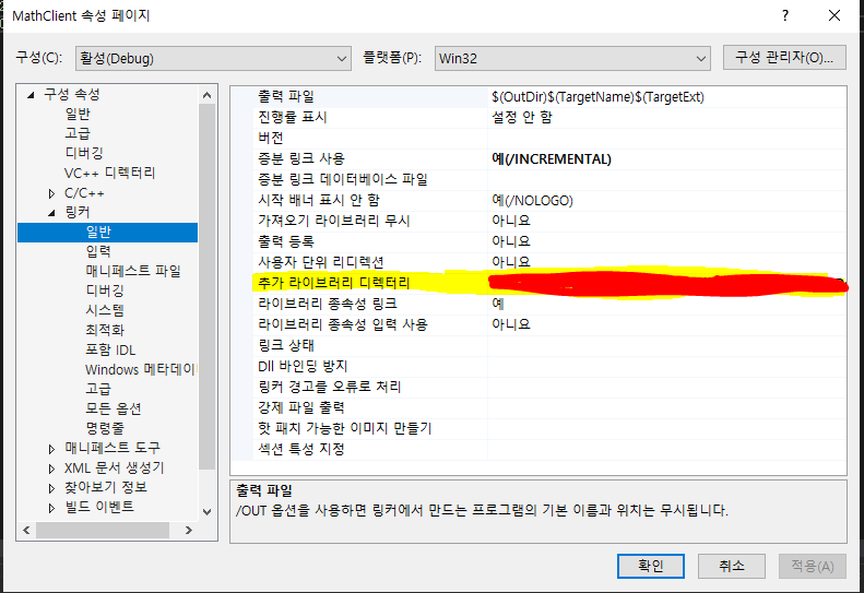 - 프로젝트의 속성 페이지를 켜고 [구성속성 $\rightarrow$ 링커 $\rightarrow$ 일반] 의 추가 라이브러리 디렉토리 칸에 MathLibrary.lib의 경로를 지정