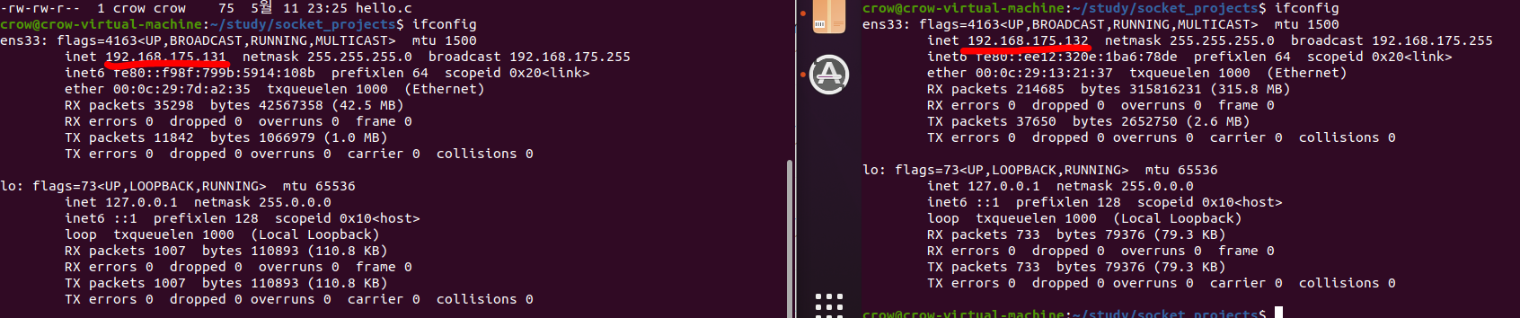 2개의 코드를 별개의 가상 OS에서 컴파일 한 후, main의 매개변수로 포트번호를 전달하고 연결을 시도해본다.