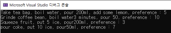 앞서 음료 종류마다 생산공정이 다르다 소개했으며, 이를 hot drink와 ice drink에서 매개변수 arg를 통해 분기점을 형성하도록 하여 각기 다르게 생산하도록 구현했다.