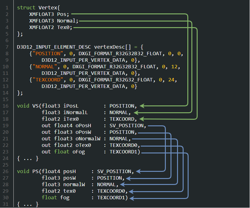 - 아래 코드는 기하 셰이더가 없는 경우에서 vertex 자료가 pixel shader에 도달하는 경로를 나타낸다.