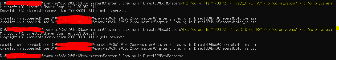 가령 vertex 및 pixel shader를 compile 하기 위해 D3DCompileFromFile 함수를 호출하는 방법은 아래와 같다.