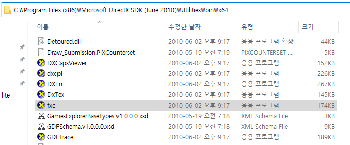 fxc는 일반적으로 DirectX SDK의 설치 경로 아래에 있으며 내컴퓨터의 경우 아래 경로에 존재한다.