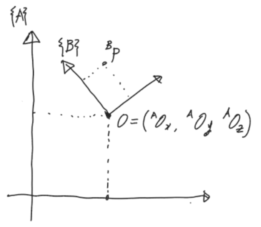 $B$좌표계의 원점이 $A$좌표계 기준 ${}^AO$위치에 있을경우 ${}^BP$를 $A$좌표계에 대해 표현하면 아래와 같다.