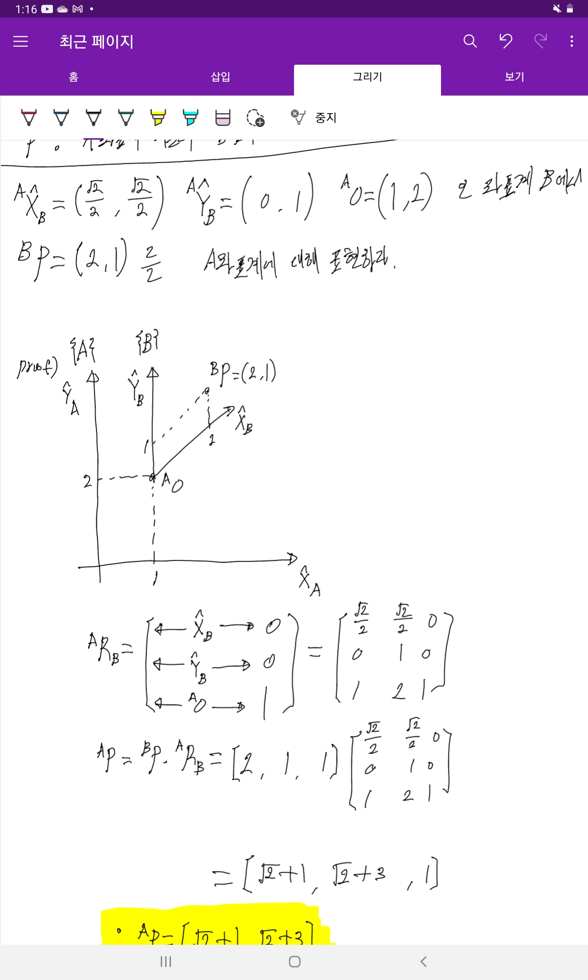 우선 ${}^BP$를 $A$의 $\hat X_A$ 기준으로 바꾸어 본다. (${}^A P_x$를 구한다.)