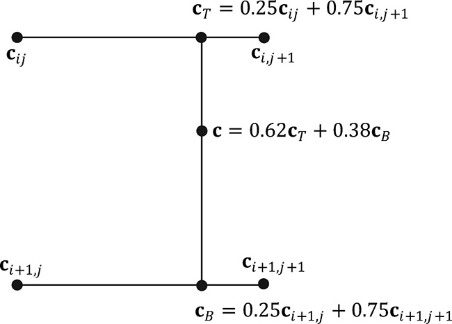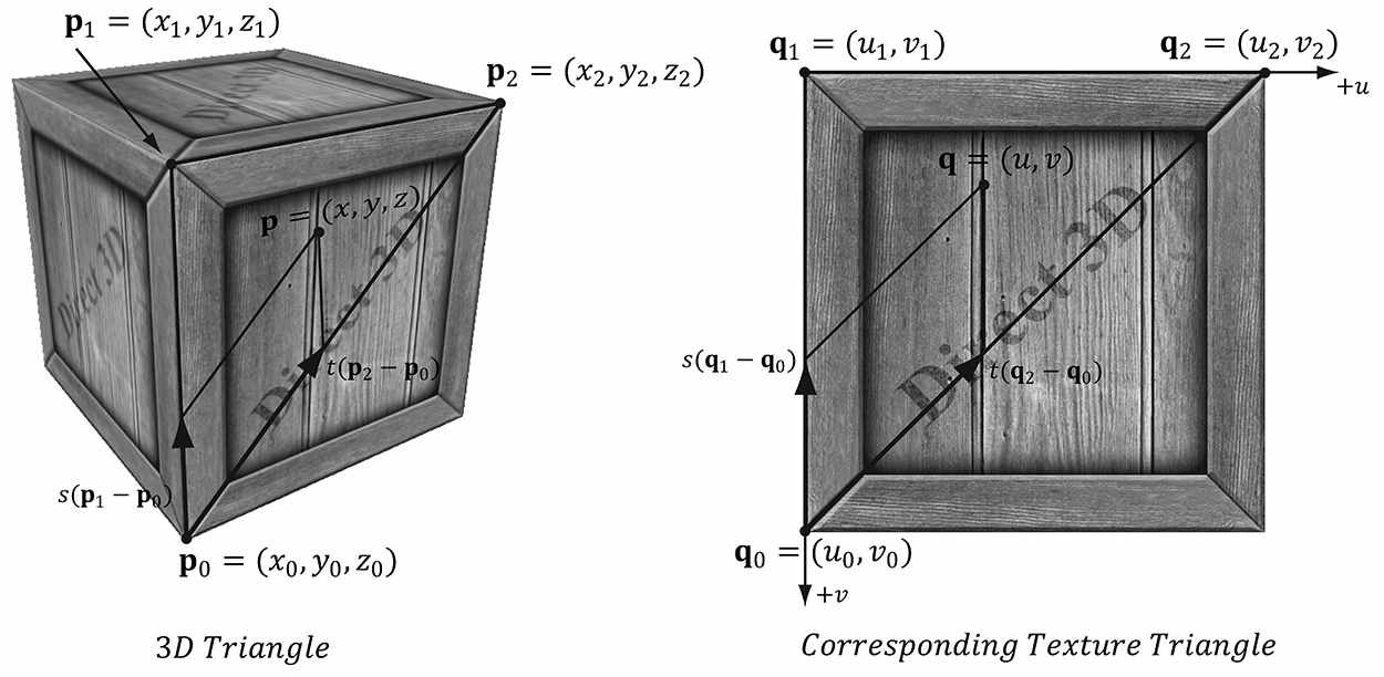 위와 같이 정의하면, 3차원 삼각형 면에 존재하는 임의의 좌표 $(x,y,z)$가 $s \geq 0, \; t \geq 0, \; s+t \leq 1$을 따르는 매개변수 $s,\; t$를 포함하는 아래 공식을 따른다.