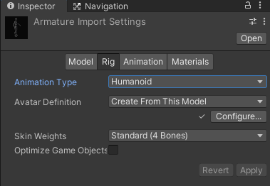 모델 파일(FBX, COLLADA 등)을 임포트한 후, Model Importer 옵션의 Rig 탭에서 Rig을 지정할 수 있습니다.
