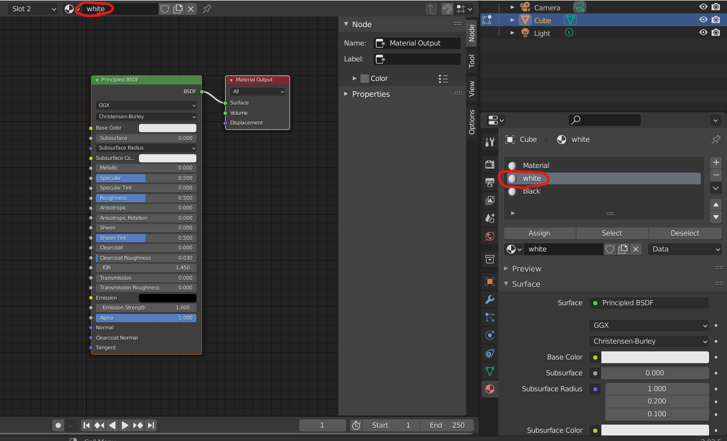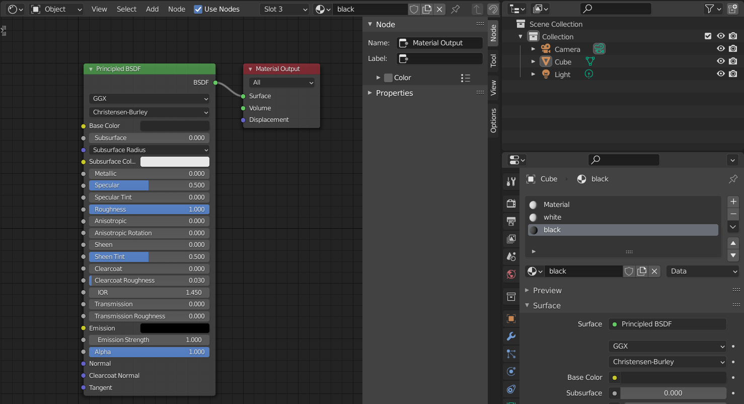 처음 material을 생성하면 가장 기본적인 principled 쉐이더와 Material Output이 연결되어 있다.