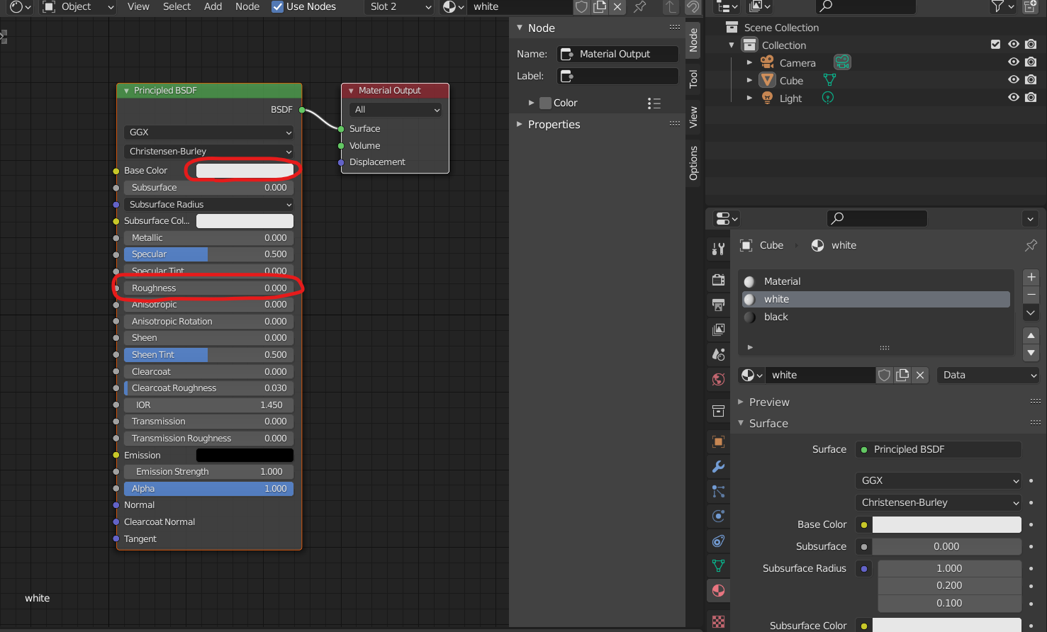 Base Color을 흰색으로 조절, Roughness (거침)을 0으로 설정