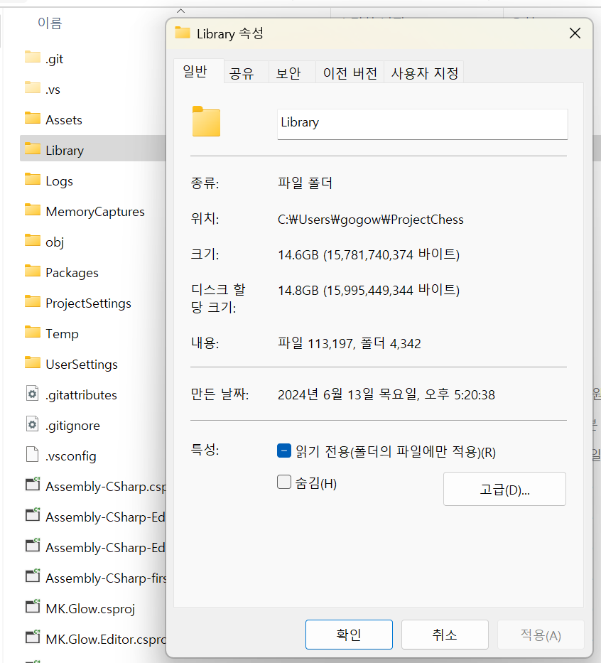 유니티 프로젝트가 저장된 폴더의 용량이 너무 크게 나와서 확인해보니, Library 폴더가 대부분을 차지하고 있음을 확인하였다.
