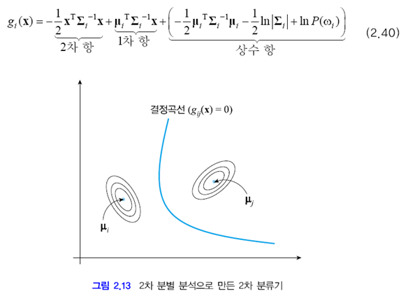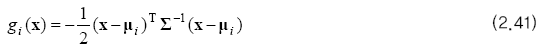 식 (2.30)에 따르면 베이시언 분류기는 (2.41)의 $g_i(x)$의 값이 가장 큰 부류로 분류한다.