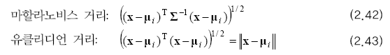 (2.41)을 최대로 한다는것은 (2.42)를 최소로 한다는 것이다. (2.42)는 $x$에서 $\mu_i$까지의 마할라노비스 거리(Maahalanobis distance)이다.
