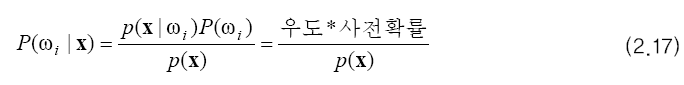 $p(w_i|x)$ : $x$라는 조건이 주어젔을때 부류 $w_i$가 발생할 확률(사후 확률)