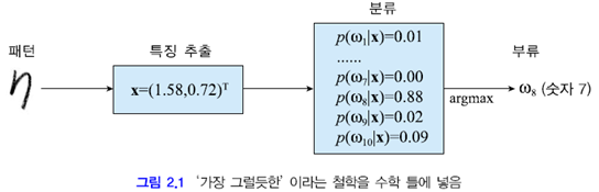 - 베이시언 분류기는 M개 부류 각각에 대해 그에 속할 확률을 출력한다. 즉 (2.30)의 베이시언 분류기에서 $g_j(x)$를 확률로 해석할 수 있다. 따라서 이 확률을 신뢰도 값으로 삼아 후처리 등에 유용하게 활용할 수 있다.