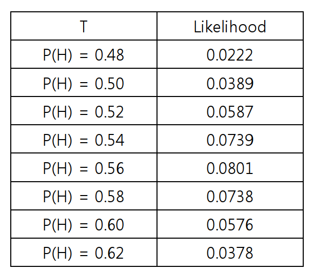 이것으로 우리는 동전 앞면이 나올 확률 P = 0.56이 됨을 알 수 있다.